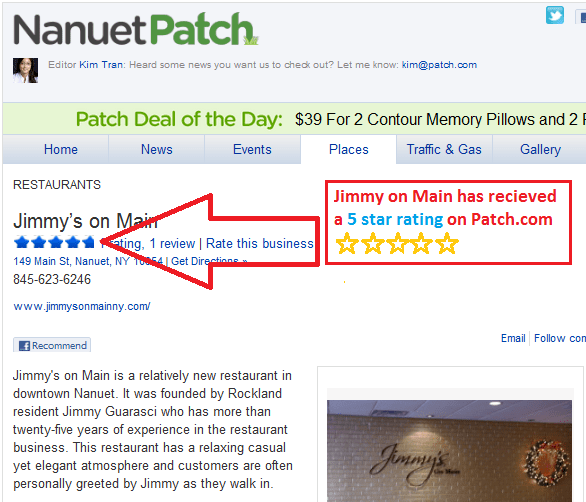 Jimmy’s on Main has received plenty of praise, and has a 5 star rating from Patch.com ♠